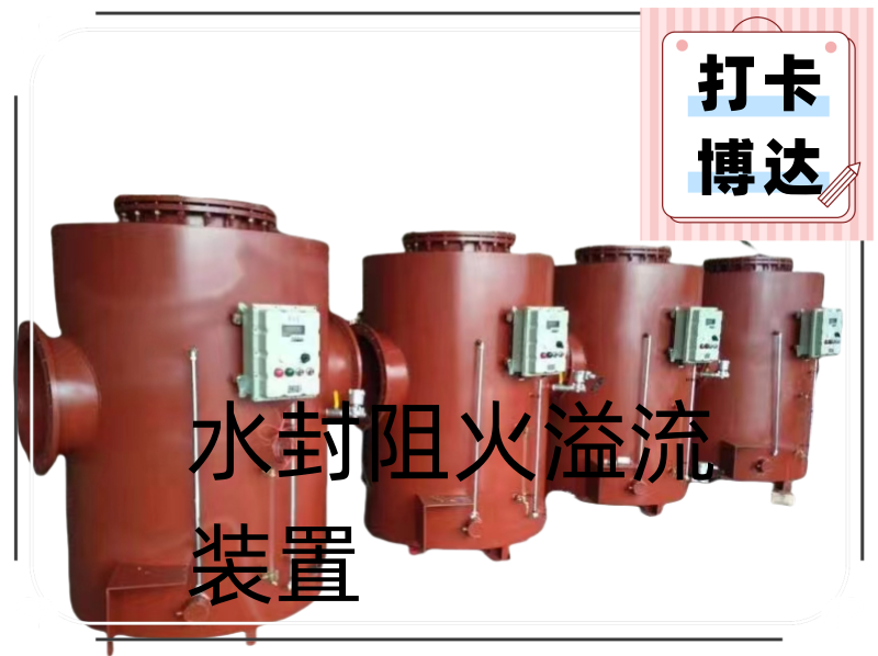 全自動(dòng)恒定水位式水封阻火器的結構主要包括:進(jìn)氣端、出氣端、水封阻火泄爆桶體、泄爆片、液位計、差壓變送器及液位控制智能表、進(jìn)水口電磁閥組、出水口電磁閥組、儀表控制箱、配對法蘭及金屬墊片等組成。